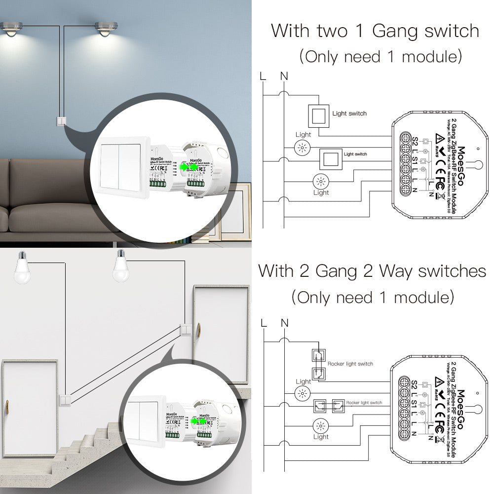2.Can be used as a 1-way or 2-way circuit (2 switches control 1 light); simply connect to 1 of the 2 switches and convert the connected device into a smart one (for 2-way circuit)