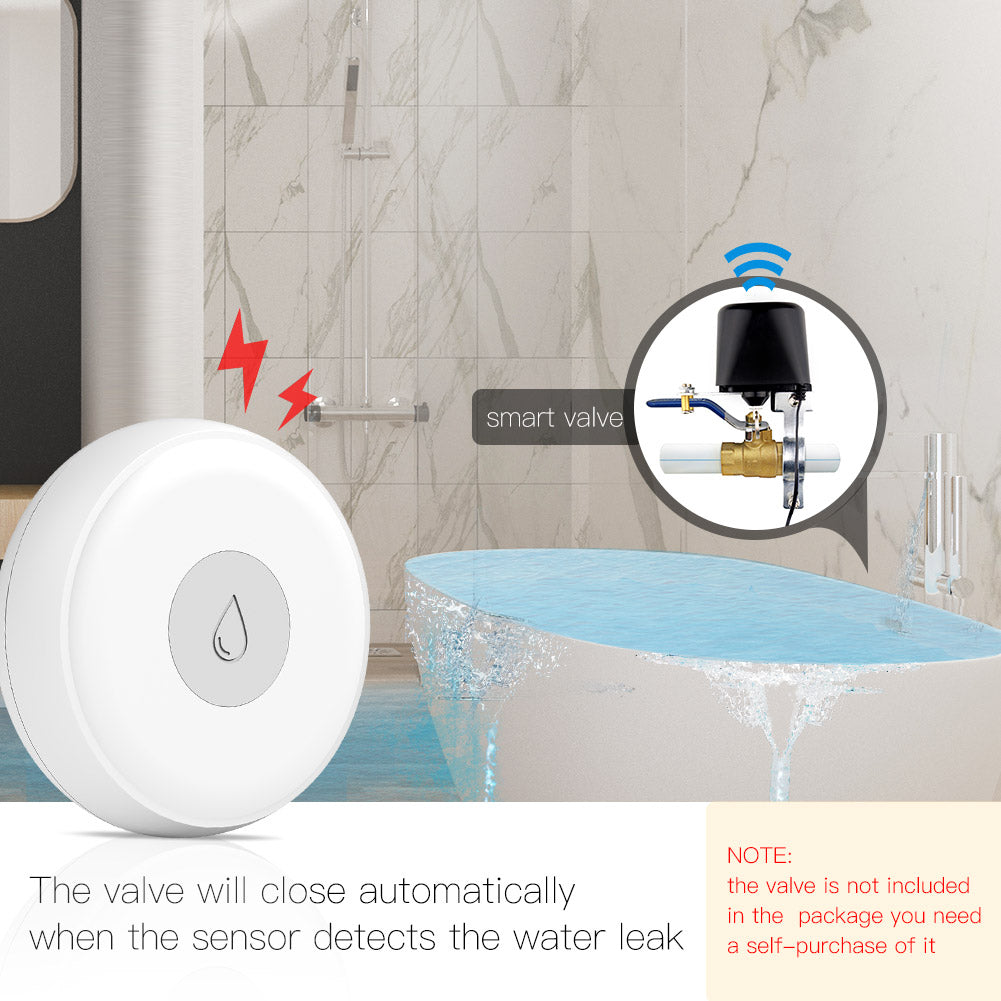 4.Wide Applications:Apply the smart flood sensor to different scenes,your garage,bathroom,kitchen and anywhere with water you like,keeping your house away from flood danger with a linkage of the smart flood sensor.(Note:Use the sensor with your smart valve together to intelligently control the irrigation condition,which enables real-time monitor and the valve will close automatically when water leaks.)