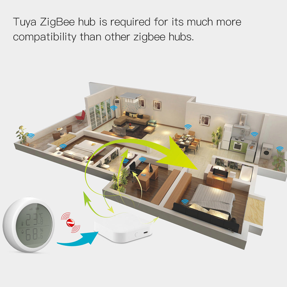 1.Tuya Smart ZigBee Temperature and HumiditySensor:A Tuya ZigBee Wireless Gateway Hub is a must to work with the temperature and humidity sensor,as well as a variety of ZigBee smart products, which is proved to be the bridge and control center for smart homes and plays an irreplaceable role for all ZigBee products and realizes the whole intelligent linkage of your house.Simply add the sensor into the ZigBee hub after adding the hub into Smart Life/Tuya App;2MQTT Setup Available.