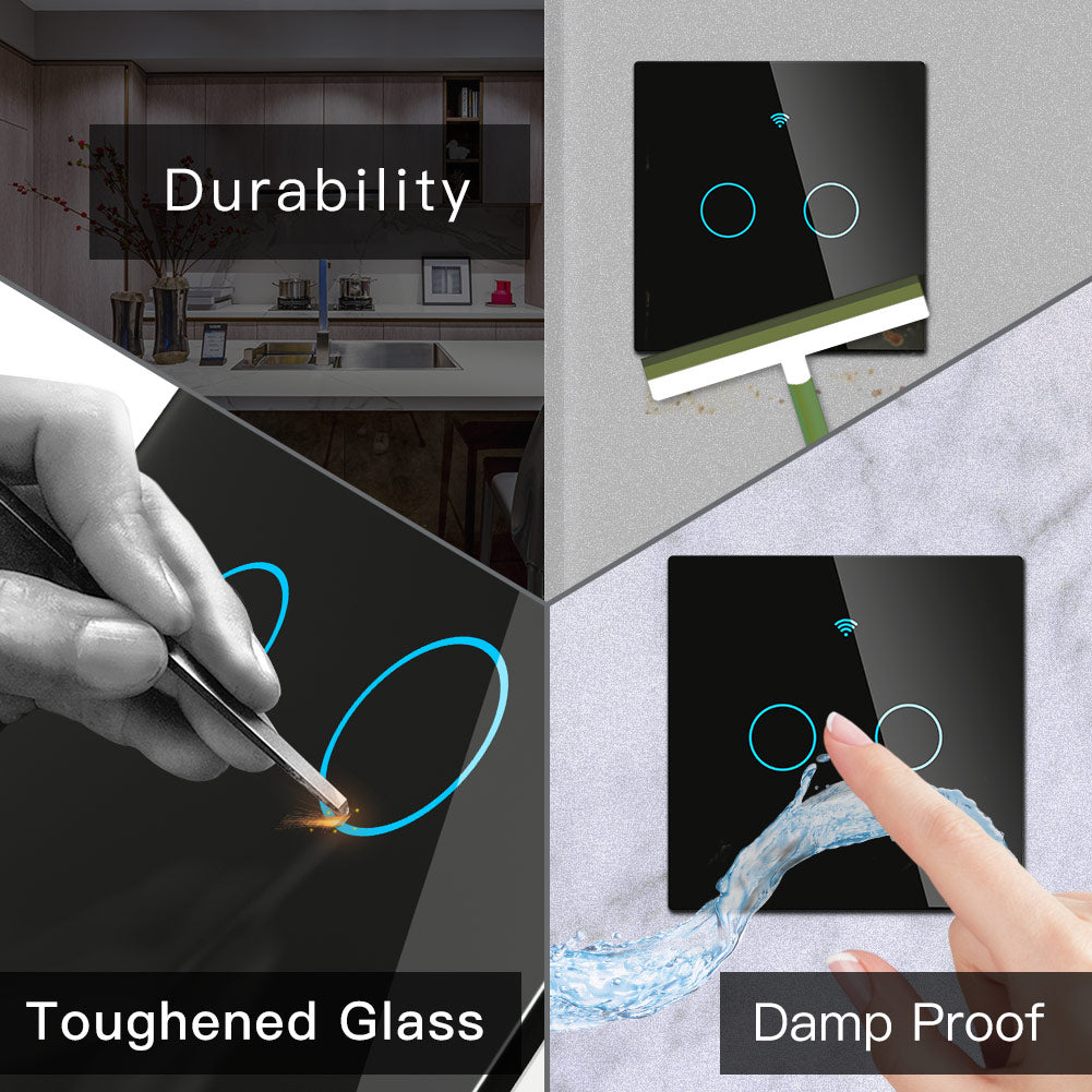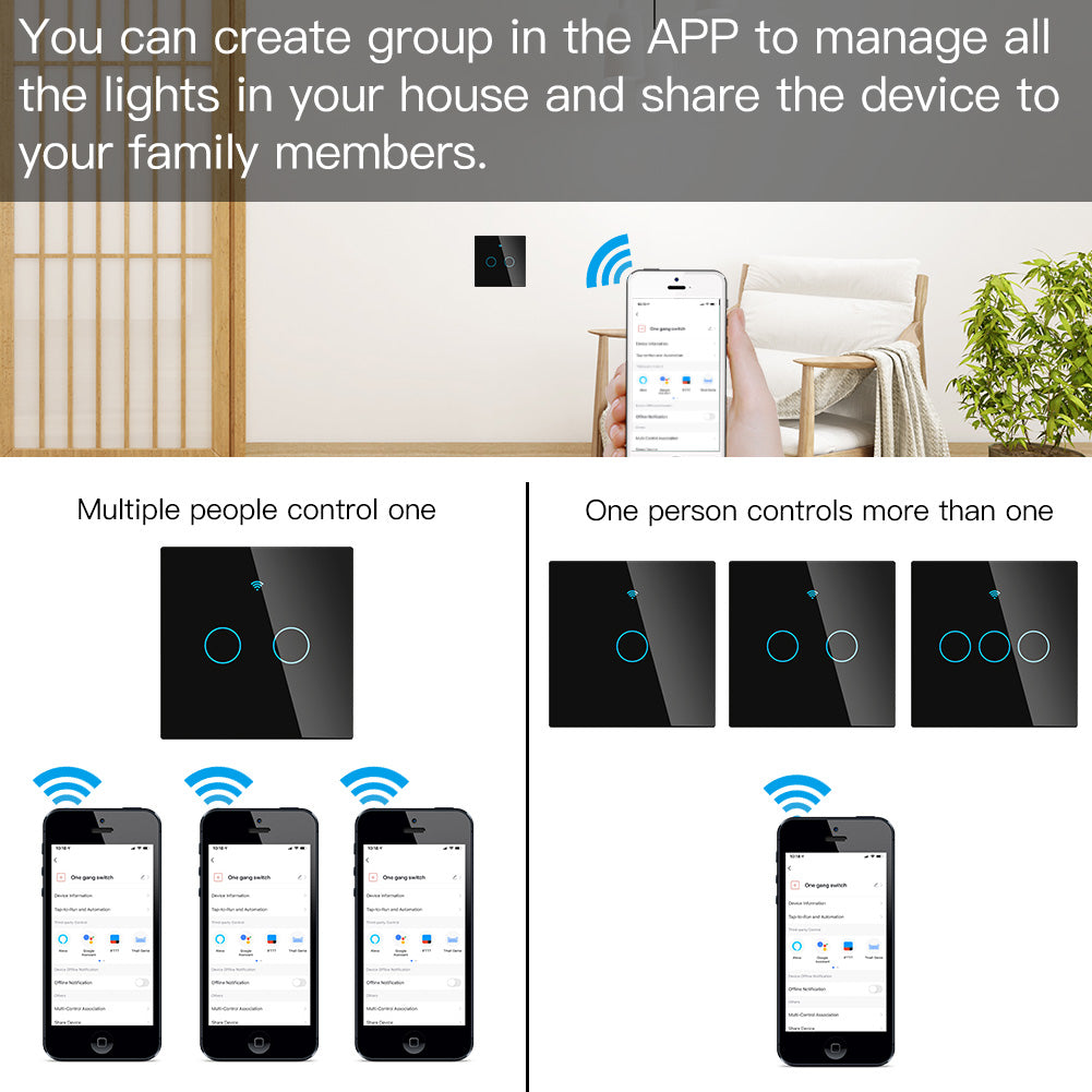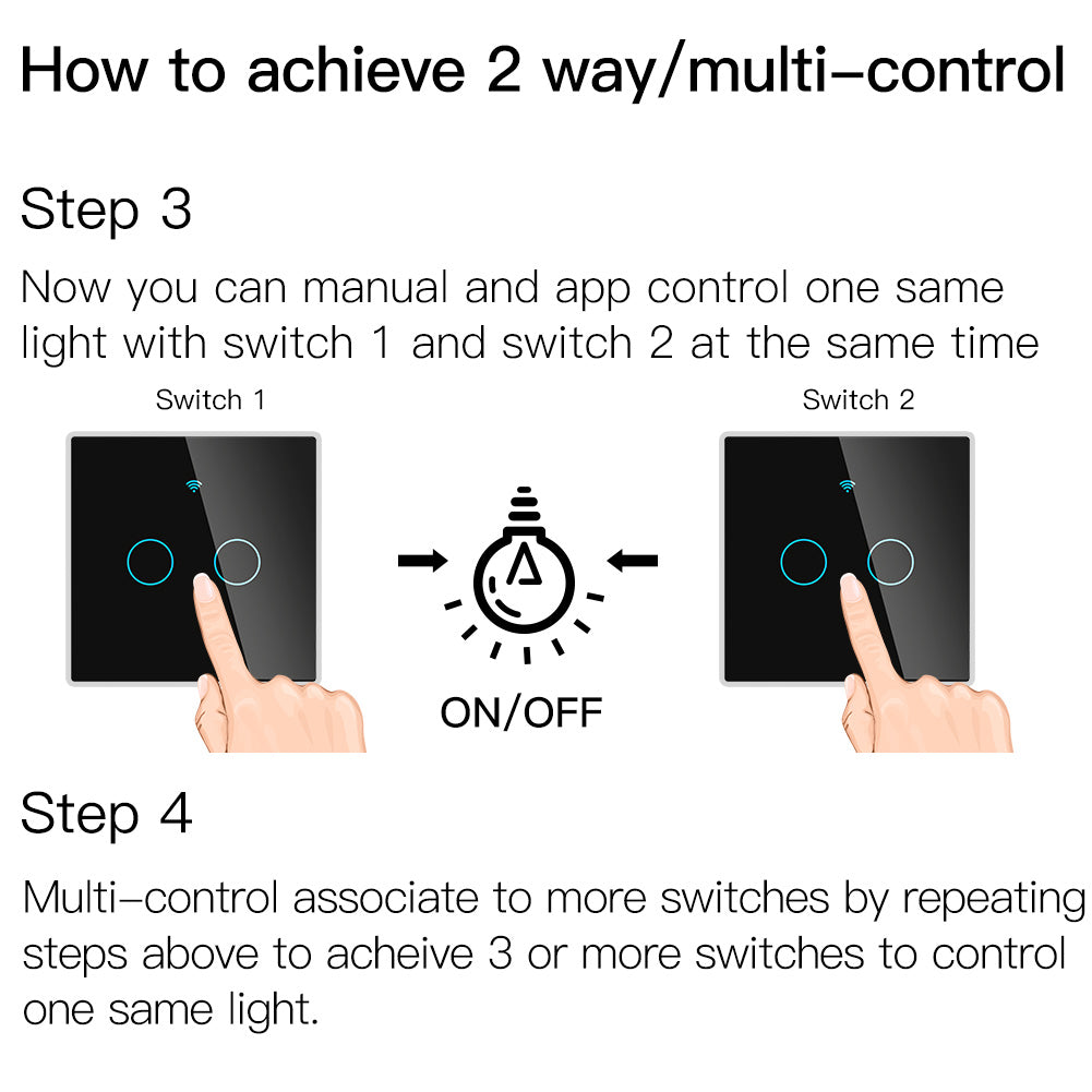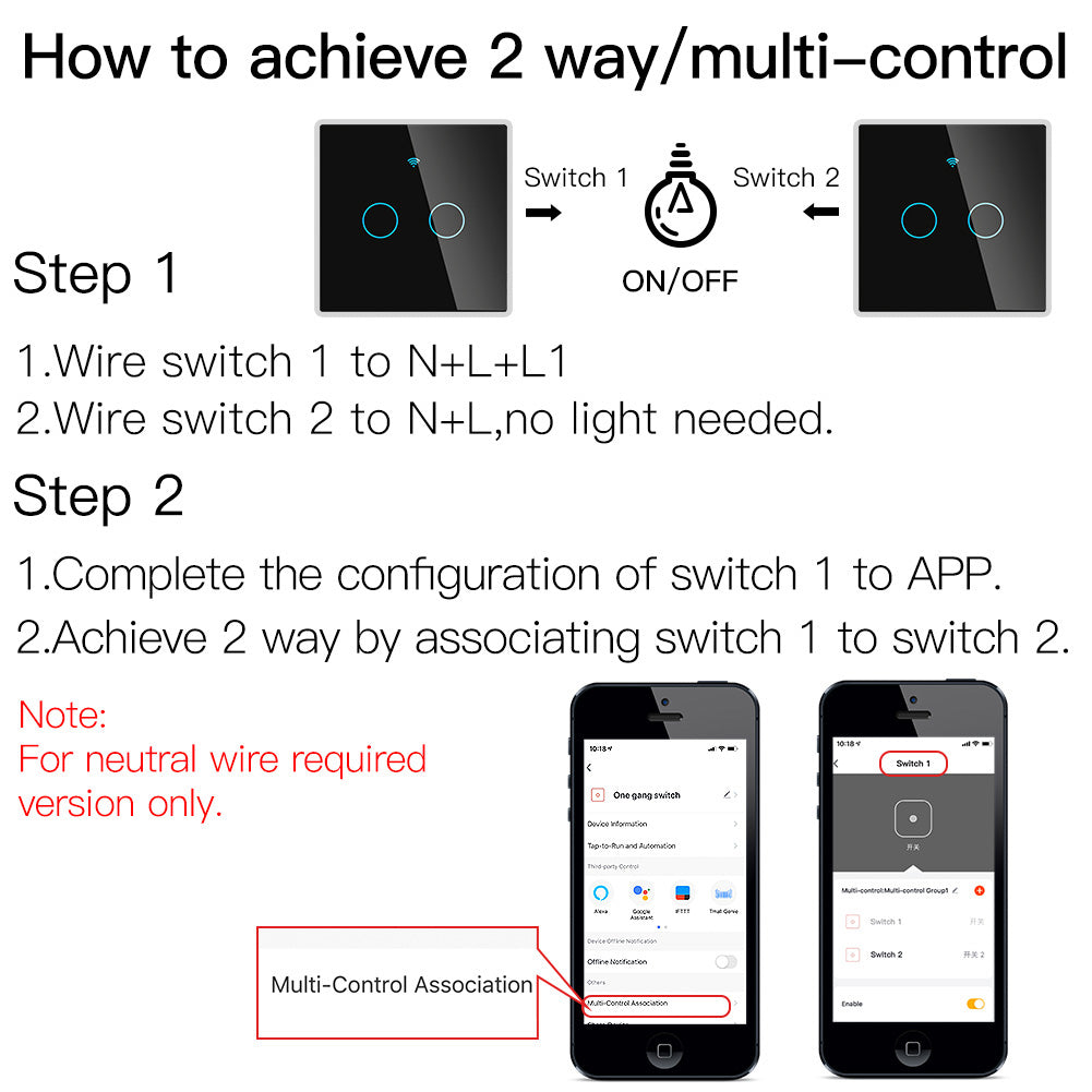 2.New idea for 2/3 Way circuit (two switches control one light)that is explained as multi-control association of this switch to other smart switches in App;ON/OFF relay status as remember last status when power off and backlight switch settingin Smart Life App for better sleep at night;capacitive touch control, turn on/off your light with a single touch and scratch resistance glass panel gives the best look to blend with any wall design.(Note:You can multi-control associate of this switch to multiple different switches,but several gangs on one switch is not available,only one gang on one switch can be associated for multi-control.)