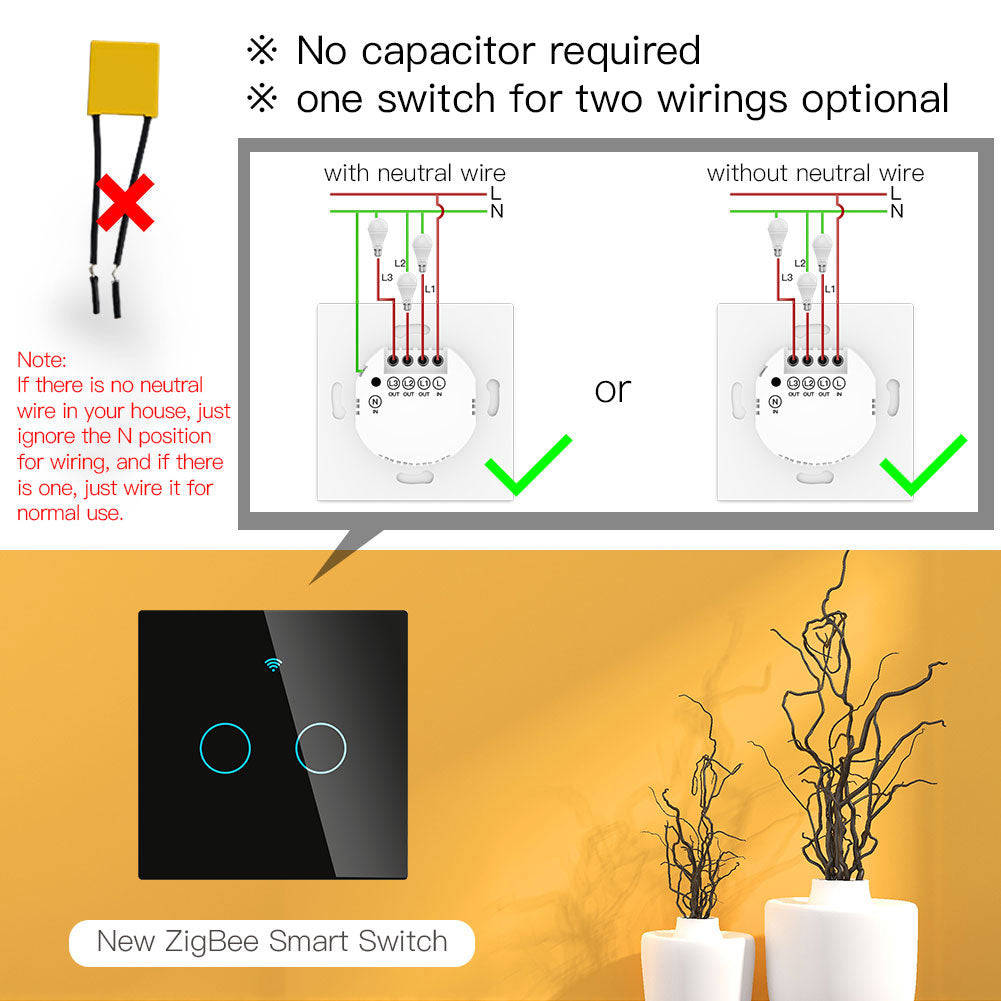 1.New design with neutral wire required and single live wire featured in one switch panel;No neutral wiring required for the single live wire version;Wire the neutral wire on the switch when needed;No capacitor needed for the new update version for better user experience without noise from electric current;Tuya Zigbee hub is required for the normal use of this switch,featured as much compatibility with tuya smart devices than any other hubs.